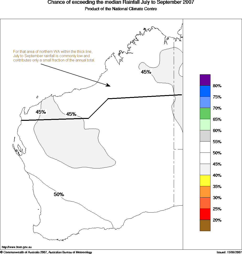 WA Seasonal Rainfall Outlook: probabilities for July to September 2007, issued 26th June 2007 | |