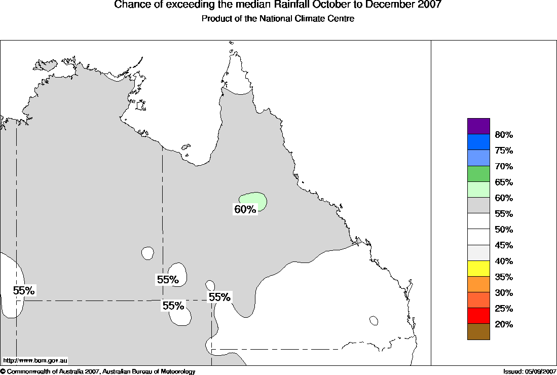Northern Aust Seasonal Rainfall Outlook: probabilities for October to December 2007, issued 25th September 2007 | |||||