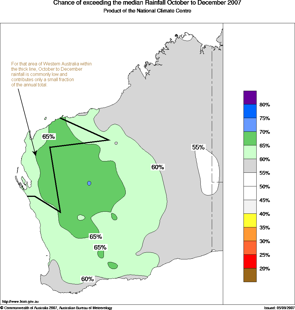 WA Seasonal Rainfall Outlook: probabilities for October to December 2007, issued 25th September 2007 | |