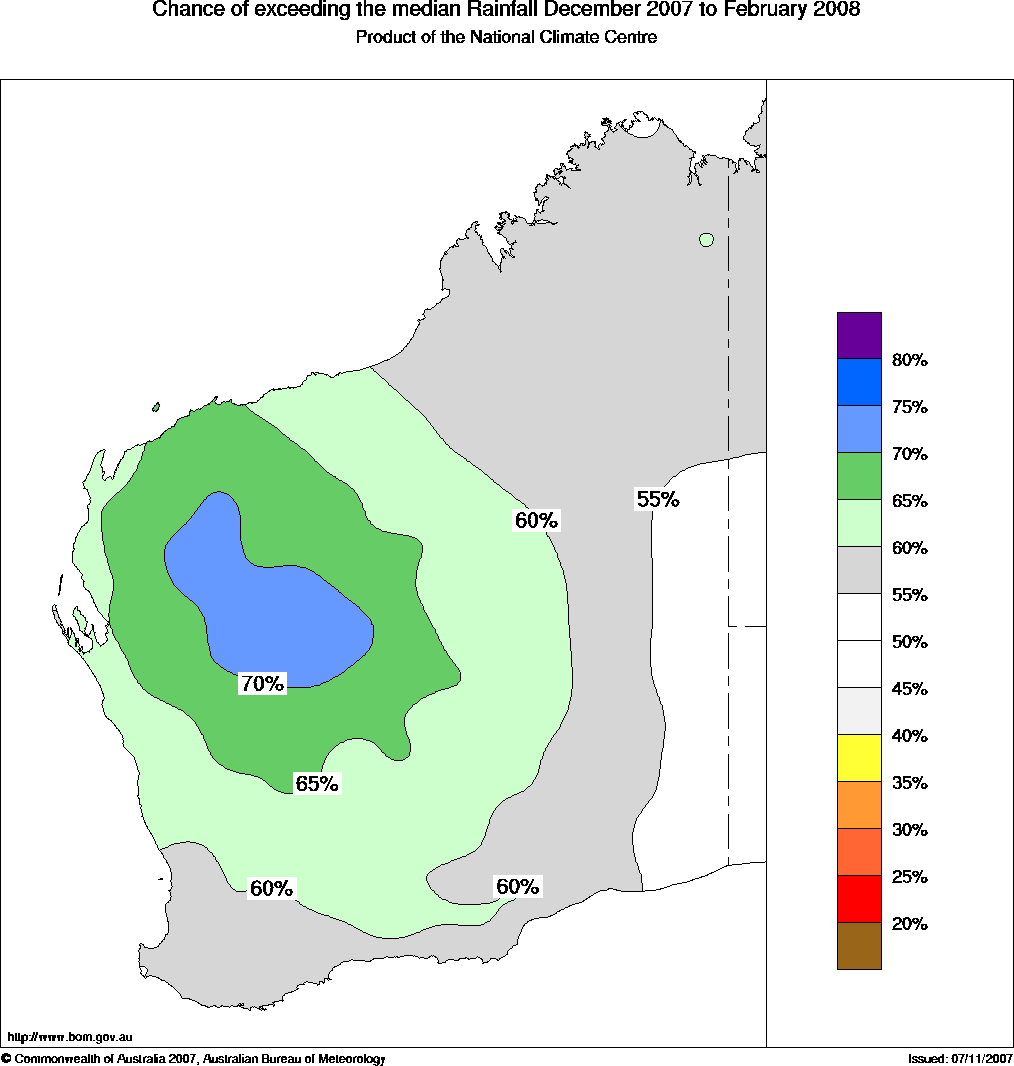 WA Seasonal Rainfall Outlook: probabilities for Summer 2007/2008, issued 22nd November 2007 | |
