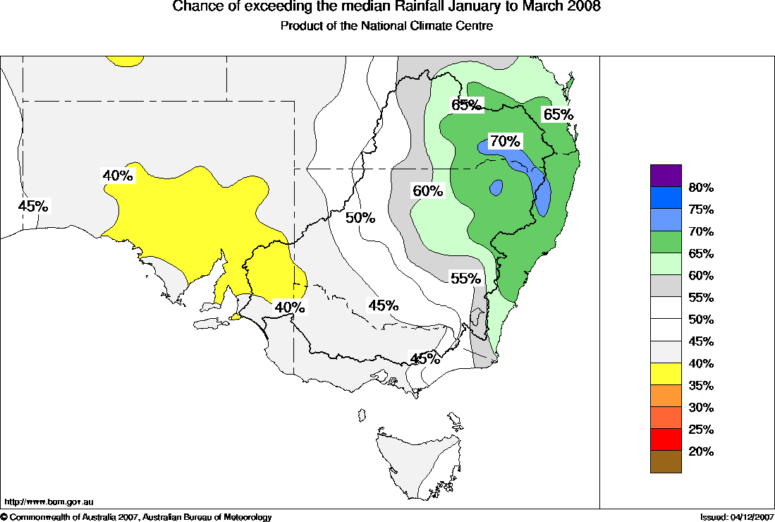 Mixed March quarter rainfall outlook for SE AustraliaFor southeastern Australia the national outlook for total March quarter rainfall (January to March), shows mixed odds for exceeding the seasonal median. There are moderate to strong shifts favouring above average totals in parts of eastern NSW, while a drier season is favoured in parts of South Australia. The pattern of seasonal rainfall odds across southeastern Australia is a result of cooling across the equatorial Pacific in association with La Niña, and continuing higher than average temperatures in the central to southeastern Indian Ocean. ![]() The chances of exceeding the median rainfall over January to March are between 60 and 75% across both the northern inland and east of NSW (see map). So for every ten years with ocean patterns like the current, about six or seven March quarters are expected to be wetter than average in these parts of southeastern Australia, while about three or four are drier. In contrast, a large part of central to eastern SA has a 35 to 40% chance of exceeding the three-month median, meaning that this area has a 60 to 65% chance of being drier than normal. Over the rest of southeastern Australia, the chances of exceeding the three-month median rainfall are between 40 and 60%. Outlook confidence is related to how consistently the Pacific and Indian Oceans affect Australian rainfall. During the March quarter, history shows the effect to be moderately consistent in much of eastern to northern NSW and in small patches in western Tasmania, southwest Victoria and western SA. Elsewhere the effect is largely only very weakly consistent (see background information). A La Niña event is in progress across the Pacific Basin and computer models indicate it will persist at least until the early part of 2008. The 30-day value of the Southern Oscillation Index (SOI) was +8 as at 12th December. For routine updates and comprehensive discussion on any developments please see the ENSO Wrap-Up. | |||||||||||