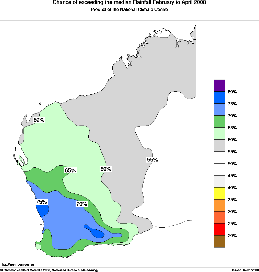 WA Seasonal Rainfall Outlook: probabilities for February to April 2008, issued 24th January 2008 | |