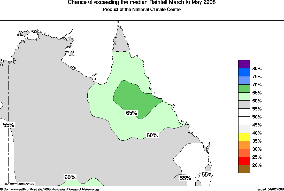Northern Aust Seasonal Rainfall Outlook: probabilities for Autumn 2008, issued 26th February 2008 | |||||