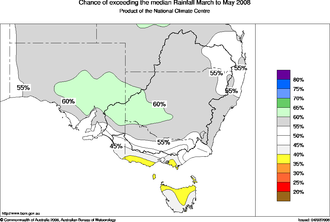 Southeastern Aust Seasonal Rainfall Outlook: probabilities for Autumn 2008, issued 26th February 2008 | |||||||||||