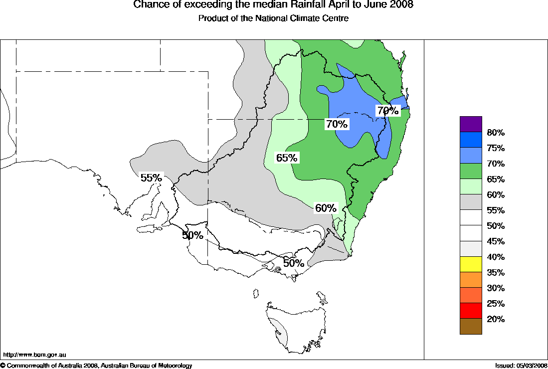 Southeastern Aust Seasonal Rainfall Outlook: probabilities for April to June 2008, issued 28th March 2008 | |||||||||||