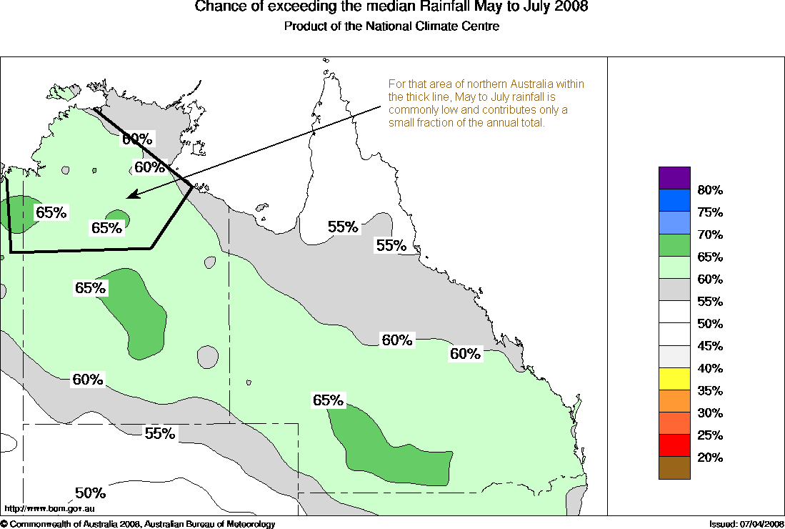 Northern Aust Seasonal Rainfall Outlook: probabilities for May to July 2008, issued 23rd April 2008 | |||||
