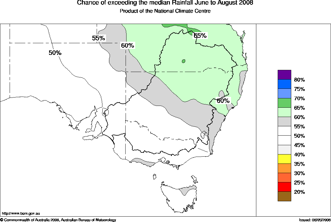 Southeastern Aust Seasonal Rainfall Outlook: probabilities for Winter 2008, issued 27th May 2008 | |||||||||||