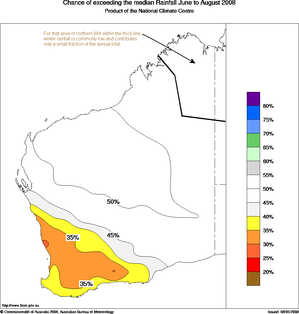 Below average winter rainfall more likely in the southwestThe Western Australia outlook for total rainfall over winter shows an increased chance towards drier conditions in the southwest. The pattern of seasonal rainfall odds across Australia is a result of higher than average temperatures in the Indian Ocean, and cooler than average waters in the central to western equatorial Pacific in association with the decaying La Niña pattern. ![]() The chances of exceeding the median rainfall over winter are between 30 and 40%, or in other words there is a 60 to 70 % chance of below median rainfall in the southwest of WA. So for every ten years with ocean patterns like the current, about six or seven winter periods are expected to be drier than average, while about three or four are wetter. For the rest of the state, the chances of exceeding the winter median rainfall are 45 to 50%, meaning the odds of being wetter than normal are about the same as the odds of being drier. It should be noted, however, that this is a seasonally drier time of year over some northern parts of Australia. Outlook confidence is related to how consistently the Pacific and Indian Oceans affect Australian rainfall. During winter, history shows this influence in Western Australia to be generally weakly consistent, reaching moderate in patches (see background information). The 2007/08 La Niña event in the Pacific Basin has decayed to neutral conditions: computer models indicate a continuation of neutral conditions through the forecast period. The 30-day value of the Southern Oscillation Index (SOI) was −3 as at 24th May. For routine updates and comprehensive discussion on any developments please see the ENSO Wrap-Up. | |