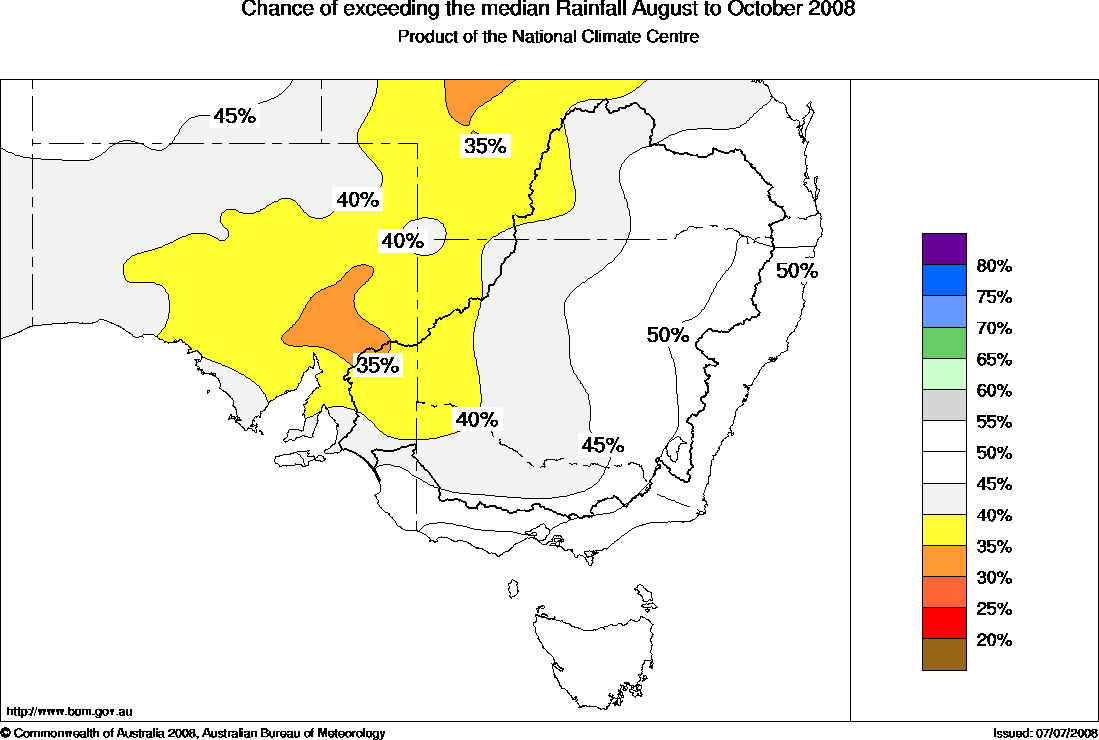 Southeastern Aust Seasonal Rainfall Outlook: probabilities for August to October 2008, issued 25th July 2008 | |||||||||