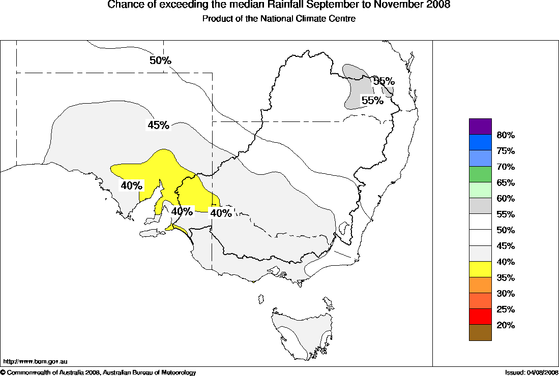 Southeastern Aust Seasonal Rainfall Outlook: probabilities for Spring 2008, issued 26th August 2008 | |||||||||