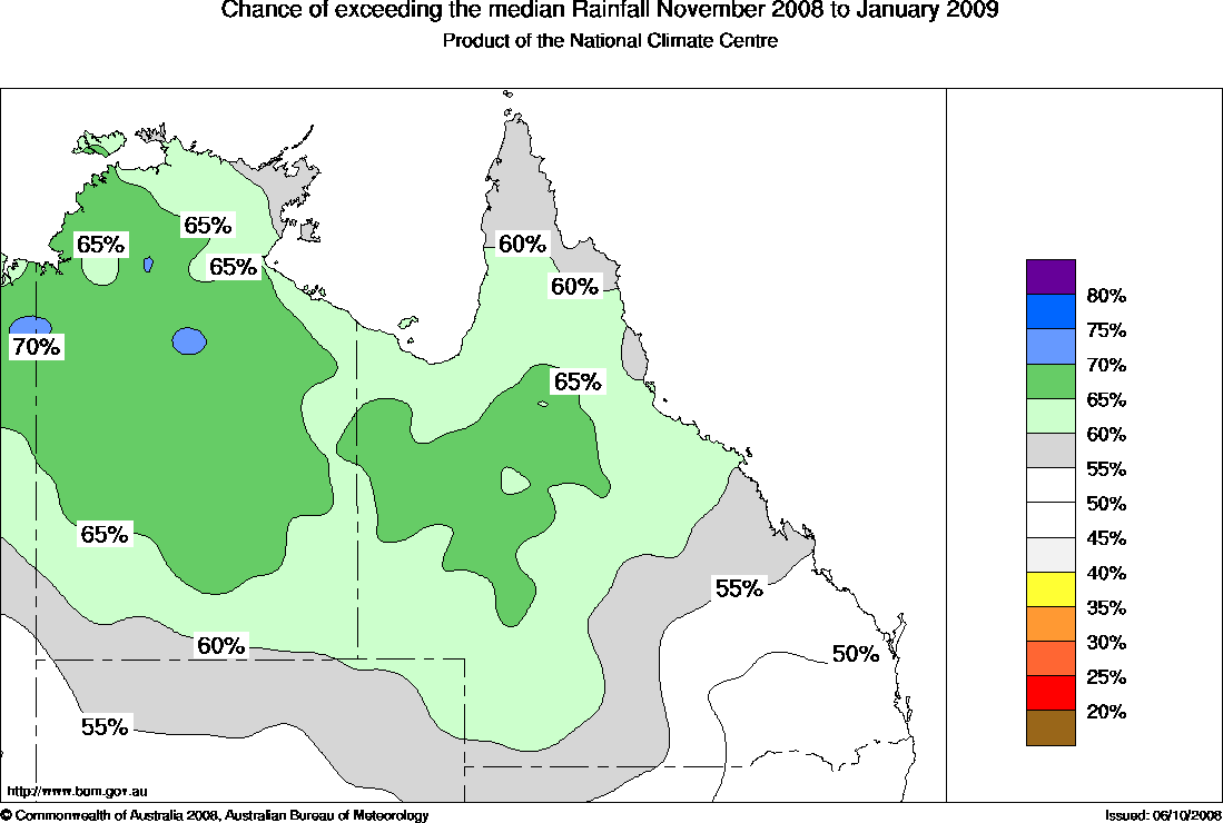 Northern Aust Seasonal Rainfall Outlook: probabilities for November 2008 to January 2009, issued 28th October 2008 | |||||
