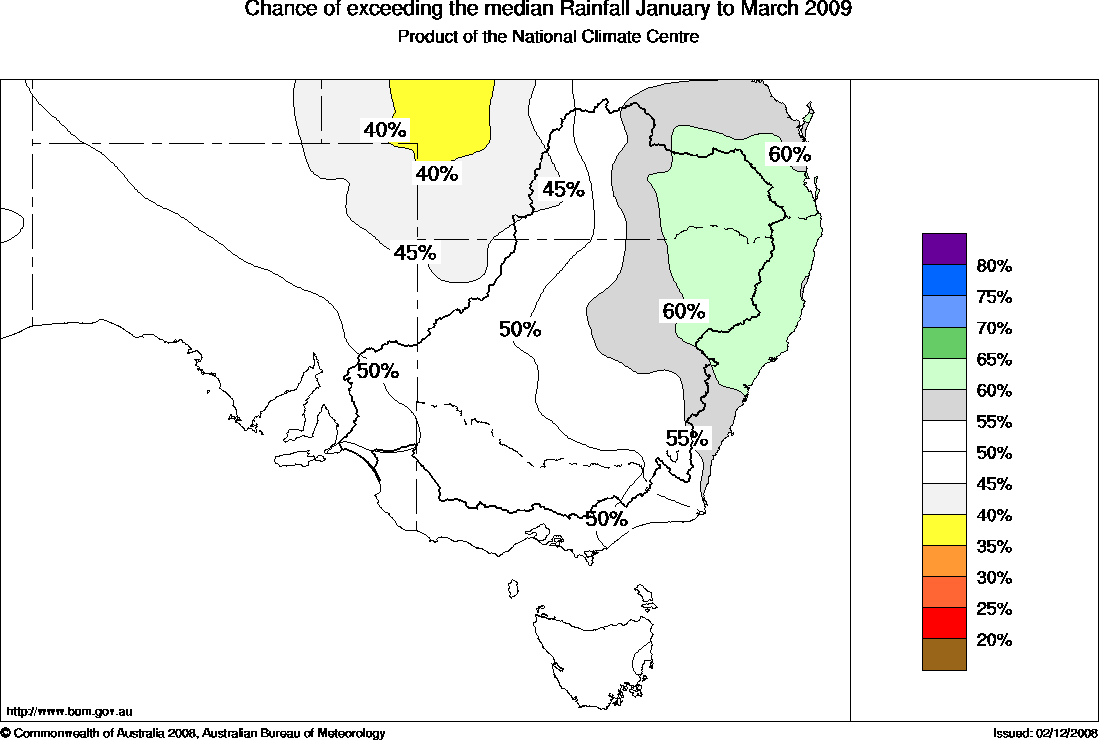 Wet start to the year favoured for northeastern NSWThe outlook for rainfall during the first quarter of 2009 (January to March) shows a moderate shift in the odds favouring wetter than normal conditions over northeastern NSW. For the remainder of southeastern Australia the odds favouring a wetter or drier first quarter of 2009 are even. Over much of northeastern NSW the chances of January to March totals exceeding the 3-month median rainfall is around 60% (see map). This means for every ten years with ocean patterns like the current, about six years are expected to be wetter than average while about four years are expected to be drier. Over the remainder of NSW, South Australia, Victoria and Tasmania the chances of exceeding the seasonal median are between 45% and 55%. This means the chances of being wetter than normal in these areas are about the same as the chances of being drier. The pattern of seasonal rainfall odds across Australia is mainly a result of continued warmth in the central Indian Ocean. The Pacific Ocean has not contributed significantly to this pattern (see below however, for a full discussion of the current state of the Pacific Ocean and ENSO). ![]() Outlook confidence is related to how consistently the Pacific and Indian Oceans affect Australian rainfall. During January to March, history shows this effect to be moderately consistent over coastal NSW and weak to moderately consistent over the northeastern inland of NSW, parts of Tasmania, as well as the Victorian coastal districts west of Port Philip and the west coast and southern part of the northwest pastoral districts of SA. However, confidence is only weakly to very weakly consistent over much of the south and southwestern NSW, most of Victoria, SA and parts of Tasmania (see background information). In these areas where outlook confidence is not high caution should be used when interpreting these outlooks. The tropical Pacific Ocean remains ENSO-neutral. Sea surface temperatures across most of the equatorial Pacific are near normal, however, cool sub-surface temperatures persist from the dateline to the South American coast and the trade winds are now stronger than normal across most of the basin. The SOI remains positive at approximately +13 for the 30 days ending 14 December. Most international computer models indicate that neutral conditions are likely to continue through summer and autumn, however, two models predict cooling. For routine updates and comprehensive discussion on any developments please see the ENSO Wrap-Up. | |||||||||