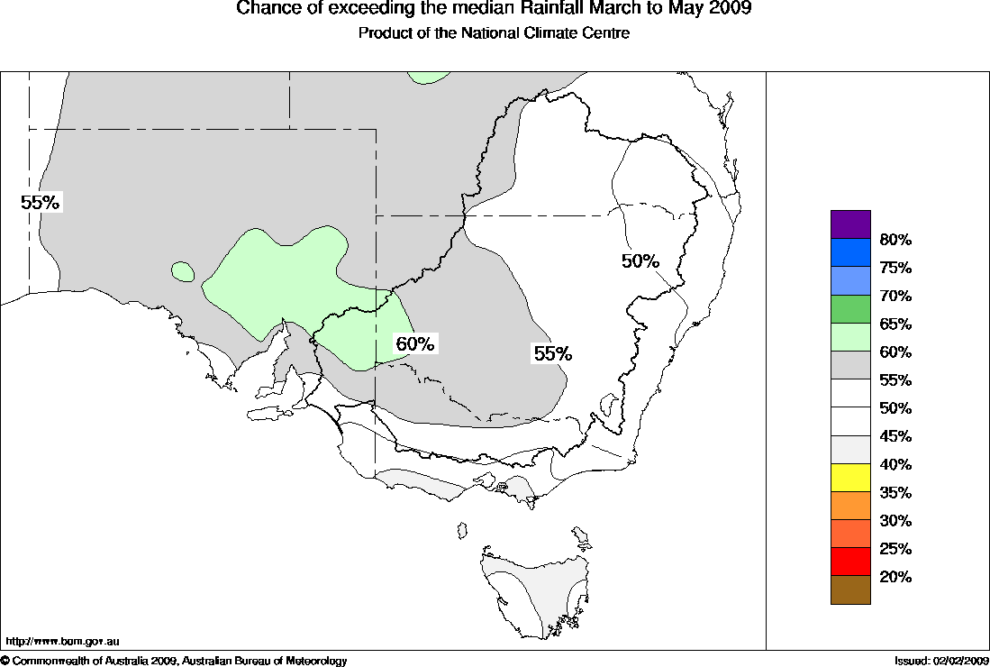 Southeastern Aust Seasonal Rainfall Outlook: probabilities for Autumn 2009, issued 20th February 2009 | |||||||||