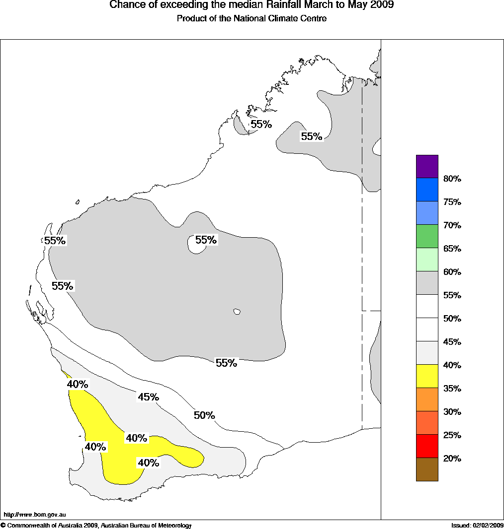 WA Seasonal Rainfall Outlook: probabilities for Autumn 2009, issued 20th February 2009 | |
