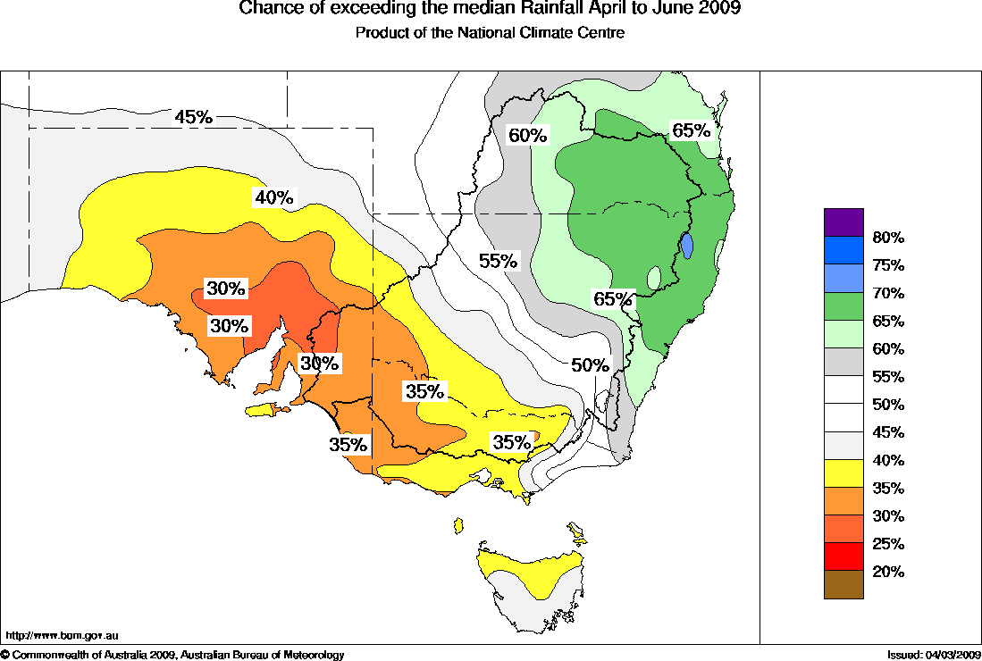 Southeastern Aust Seasonal Rainfall Outlook: probabilities for April to June 2009, issued 24th March 2009 | |||||||||