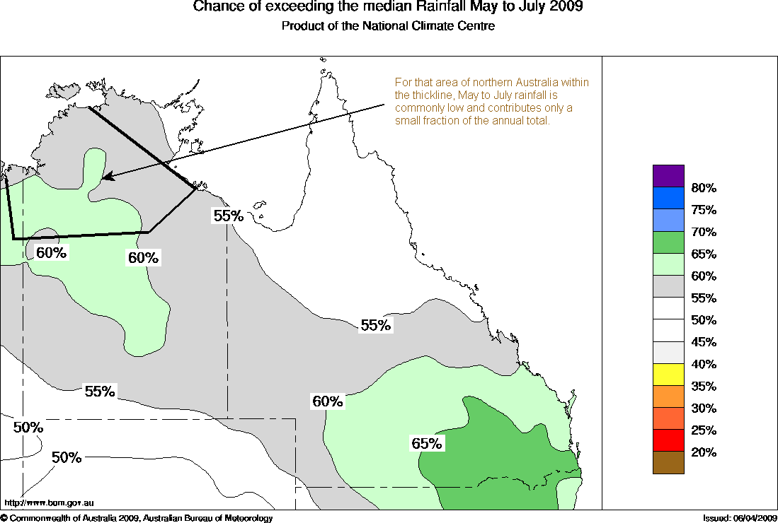 Northern Aust Seasonal Rainfall Outlook: probabilities for May to July 2009, issued 24th April 2009 | |||||