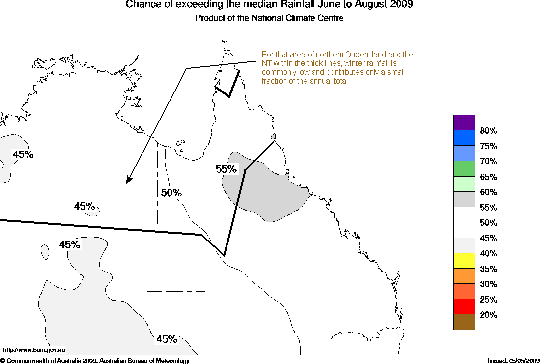 Northern Aust Seasonal Rainfall Outlook: probabilities for Winter 2009, issued 26th May 2009 | |||||
