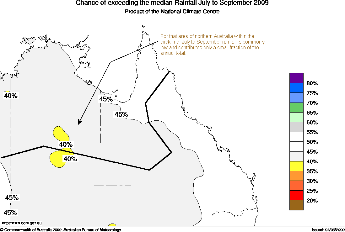 Northern Aust Seasonal Rainfall Outlook: probabilities for July to September 2009, issued 23rd June 2009 | |||||