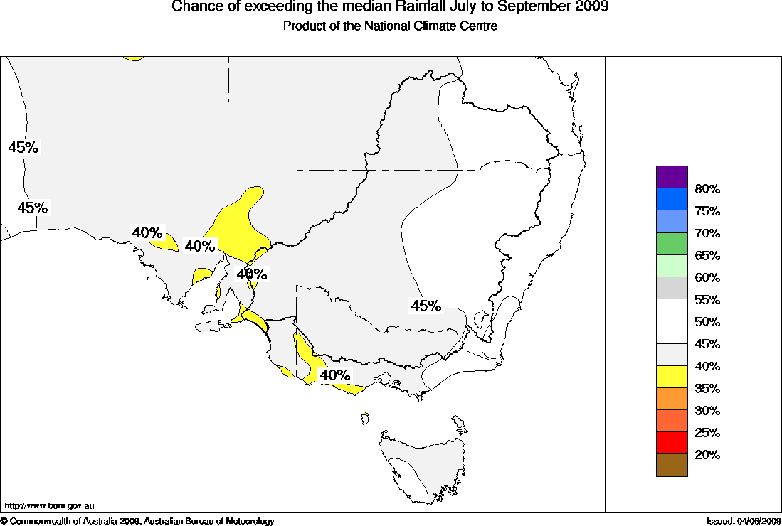 Southeastern Aust Seasonal Rainfall Outlook: probabilities for July to September 2009, issued 23rd June 2009 | |||||||||