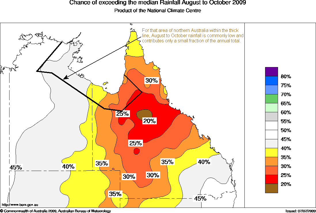 Northern Aust Seasonal Rainfall Outlook: probabilities for August to October 2009, issued 24th July 2009 | |||||