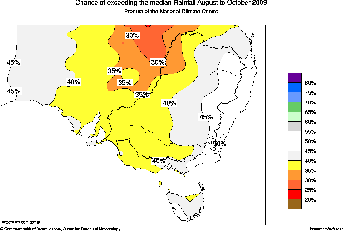 Southeastern Aust Seasonal Rainfall Outlook: probabilities for August to October 2009, issued 24th July 2009 | |||||||||