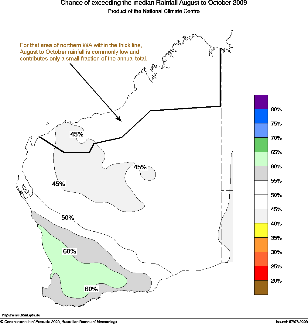 WA Seasonal Rainfall Outlook: probabilities for August to October 2009, issued 24th July 2009 | |