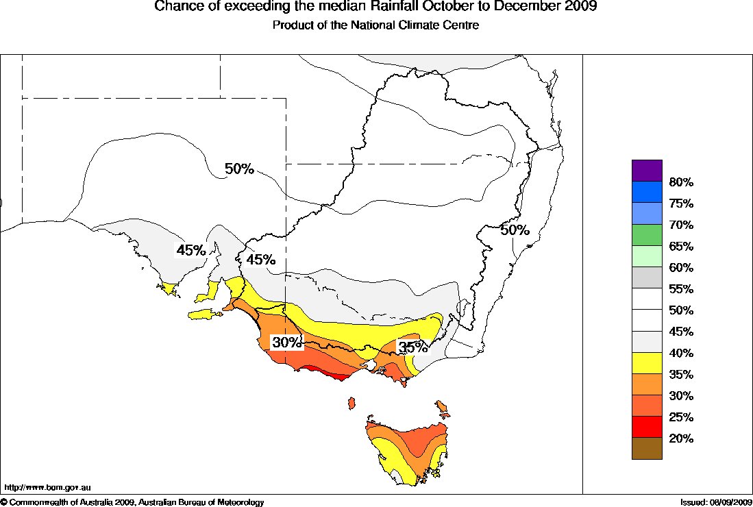 Drier December quarter favoured in southern parts of SE AustraliaFor southeastern Australia, the outlook for rainfall over the December quarter (October to December) shows a moderate to strong shift in the odds favouring a drier than normal season across southern areas, including Tasmania. The pattern of seasonal rainfall odds across southeastern Australia is a result of recent warm conditions in both the Pacific and Indian Oceans. The Pacific influence (El Niño) has had the stronger effect. ![]() The chances of exceeding the median rainfall for October to December are between 25 and 40% over Tasmania, much of Victoria and southeast SA (see map). This means that for every ten years with ocean patterns like the current, about six or seven years are expected to be drier than average over these regions, while about three or four years are wetter. Across NSW and the remaining parts of both Victoria and SA, the chances of exceeding the median rainfall for October to December are between 40 and 55%, meaning that above average falls are about as equally likely as below average falls in these regions. New: An expanded set of seasonal rainfall outlook maps and tables, including the probabilities of seasonal rainfall exceeding given totals (e.g. 200 mm), is available on the "Water and the Land" (WATL) part of the Bureau's website. Outlook confidence is related to how consistently the Pacific and Indian Oceans affect Australian rainfall. During October to December, history shows this effect to be moderately consistent over the western half of NSW, the eastern half of SA, Victoria and central Tasmania. However, confidence is only weakly to very weakly consistent over the northeast quarter of NSW and the western half of SA (see background information). An unusual El Niño event persists across the Pacific Basin, with most leading climate models forecasting the event to peak late in 2009. El Niño events are usually (but not always) associated with below normal rainfall in the second half of the year across large parts of southern and inland eastern Australia. The SOI is approximately +3 for the 30 days ending 19 September. For routine updates and comprehensive discussion on any developments please see the ENSO Wrap-Up. | |||||||||