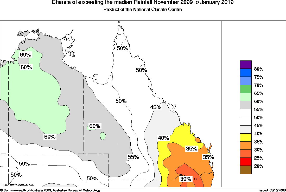 Mixed rainfall odds for Northern AustraliaThe North Australian outlook for rainfall shows a mixed chance of exceeding the median rainfall over the late spring to mid-summer period (November-January). Drier than normal conditions are favoured for southeast Queensland, whereas above average three-month totals are favoured in the central and western NT. The pattern of seasonal rainfall odds across northern Australia is a result of higher than average temperatures in both the Pacific and Indian Oceans. The contribution of the warm Pacific biases the climate towards below average rainfall across eastern Australia. The warm Indian Ocean promotes wetter than average conditions across the tropics, more so in western parts. ![]() The chances of exceeding the median rainfall for November to January are between 25 and 40% over southeast Queensland (see map). This means that for every ten years with ocean patterns like the current, about six or seven years are expected to be drier than average over these regions, while about three or four years are wetter. Contrasting this, the chance of wetter than average conditions is between 60 and 65% for western and central parts of the NT. Across the rest of northern Australia, including central and northern Queensland, the chances of exceeding the median rainfall for November to January are between 40 and 60%, meaning that above average falls are about as equally likely as below average falls in these regions. New: An expanded set of seasonal rainfall outlook maps and tables, including the probabilities of seasonal rainfall exceeding given totals (e.g. 200 mm), is available on the "Water and the Land" (WATL) part of the Bureau's website. Outlook confidence is related to how consistently the Pacific and Indian Oceans affect Australian rainfall. During the November to January period, history shows this effect to be moderately consistent over much of northern Australia (see background information). An El Niño event persists across the Pacific Basin, with most leading climate models suggesting tropical ocean temperatures will remain above El Niño thresholds until at least early 2010. El Niño events are usually (but not always) associated with below normal rainfall in the second half of the year across large parts of southern and inland eastern Australia. The SOI is approximately −8 for the 30 days ending 20 October. For routine updates and comprehensive discussion on any developments please see the ENSO Wrap-Up. | |||||