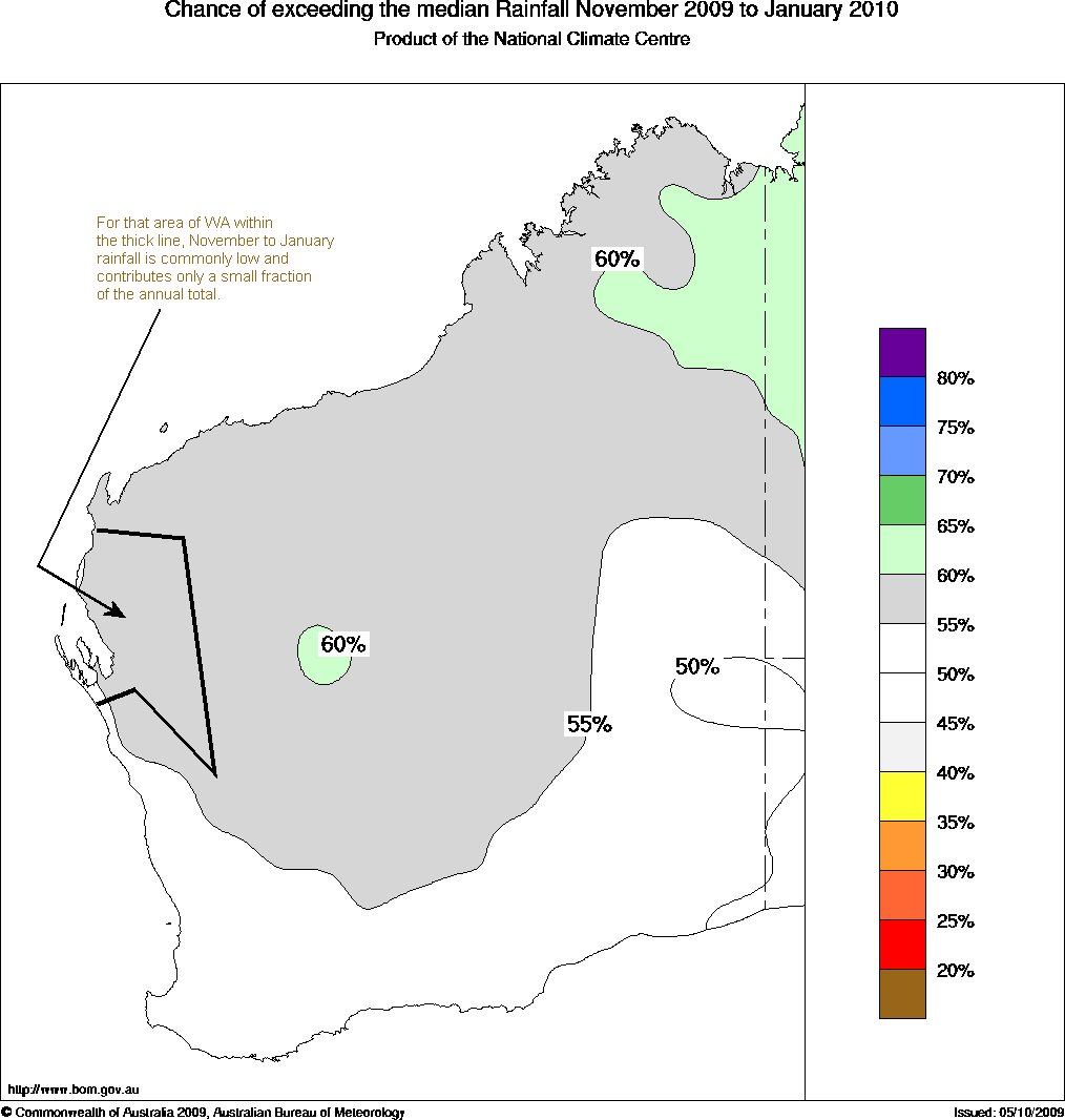 WA Seasonal Rainfall Outlook: probabilities for November 2009 to January 2010, issued 23rd October 2009 | |