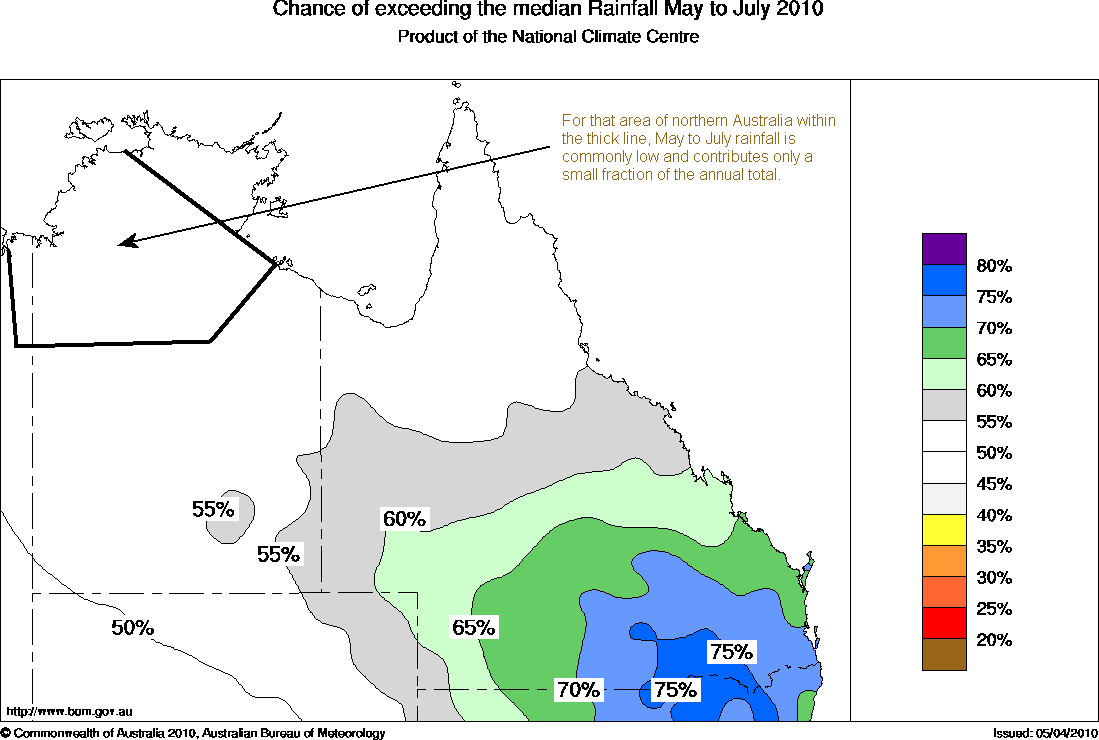 Across the rest (and most) of northern Australia, the chances of exceeding the median May to July rainfall are between 40 and 60%, meaning that above average falls are about as equally likely as below average falls. However, it should be noted that in the northern part of the NT, rainfall is commonly low during this period, contributing only a small fraction of the annual total.