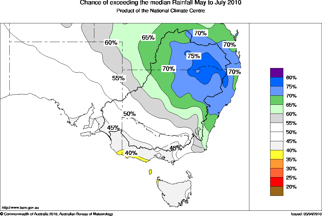 Across the rest of southeastern Australia, the chances of exceeding the median May to July rainfall are between 40 and 60%, meaning that above average falls are about as equally likely as below average falls.