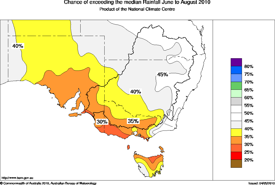 Across the rest of south-eastern Australia, the chances of exceeding the median winter rainfall are between 40 and 60%, meaning that above average falls are about as equally likely as below average falls.