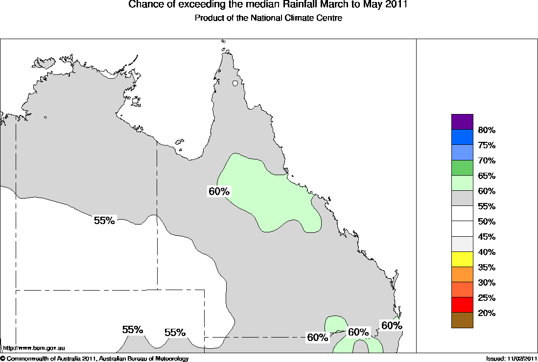 The chances of receiving above median rainfall during the March to May period are between 60 and 65% in a region centered on Townsville, as well as parts of far southern Queensland (see map). Such odds mean that for every ten years with similar ocean patterns to those currently observed, about six March to May periods would be expected to be wetter than average over these areas, while about four years would be expected to be drier. However, this outlook should be used with caution in this area due to the low confidence levels (see below).