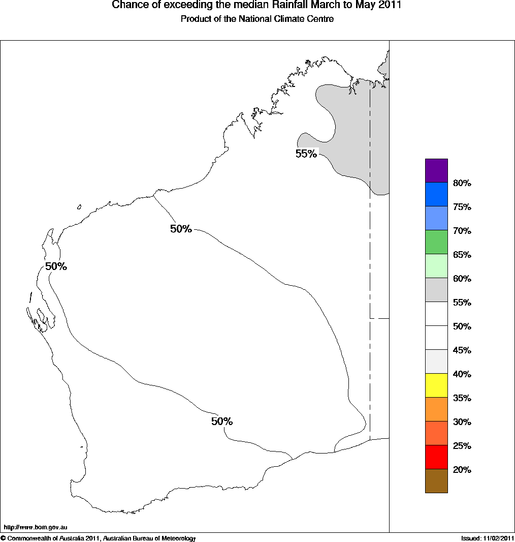 The chances of receiving the median rainfall during the March to May period are between 45 and 55% across most of WA (see map), which means in years with similar ocean patterns to those currently observed, above average falls are about as equally likely as below average falls.