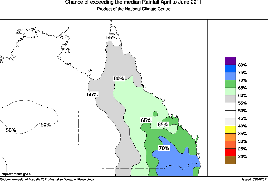 The chances of receiving above median rainfall during the April to June period are between 60 and 75% along the eastern Queensland coast with the strongest odds in southern Queensland (see map). Such odds mean that for every ten years with similar ocean patterns to those currently observed, about six to seven April to June periods would be expected to be wetter than average over these areas, while about three to four years would be drier.