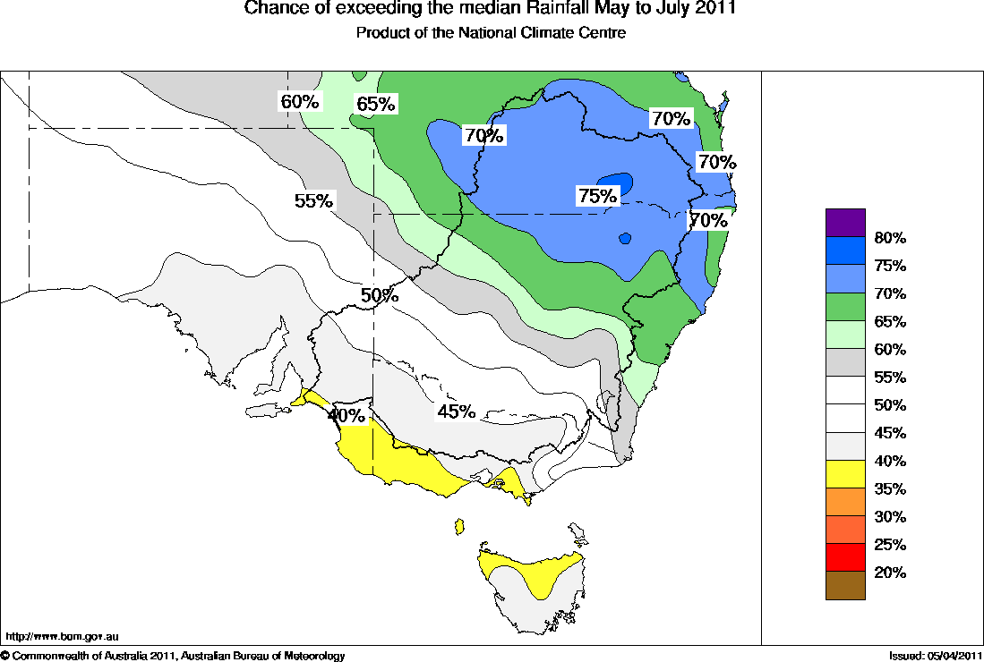 Southeastern Aust Seasonal Rainfall Outlook: probabilities for May to July 2011, issued 19th April 2011
