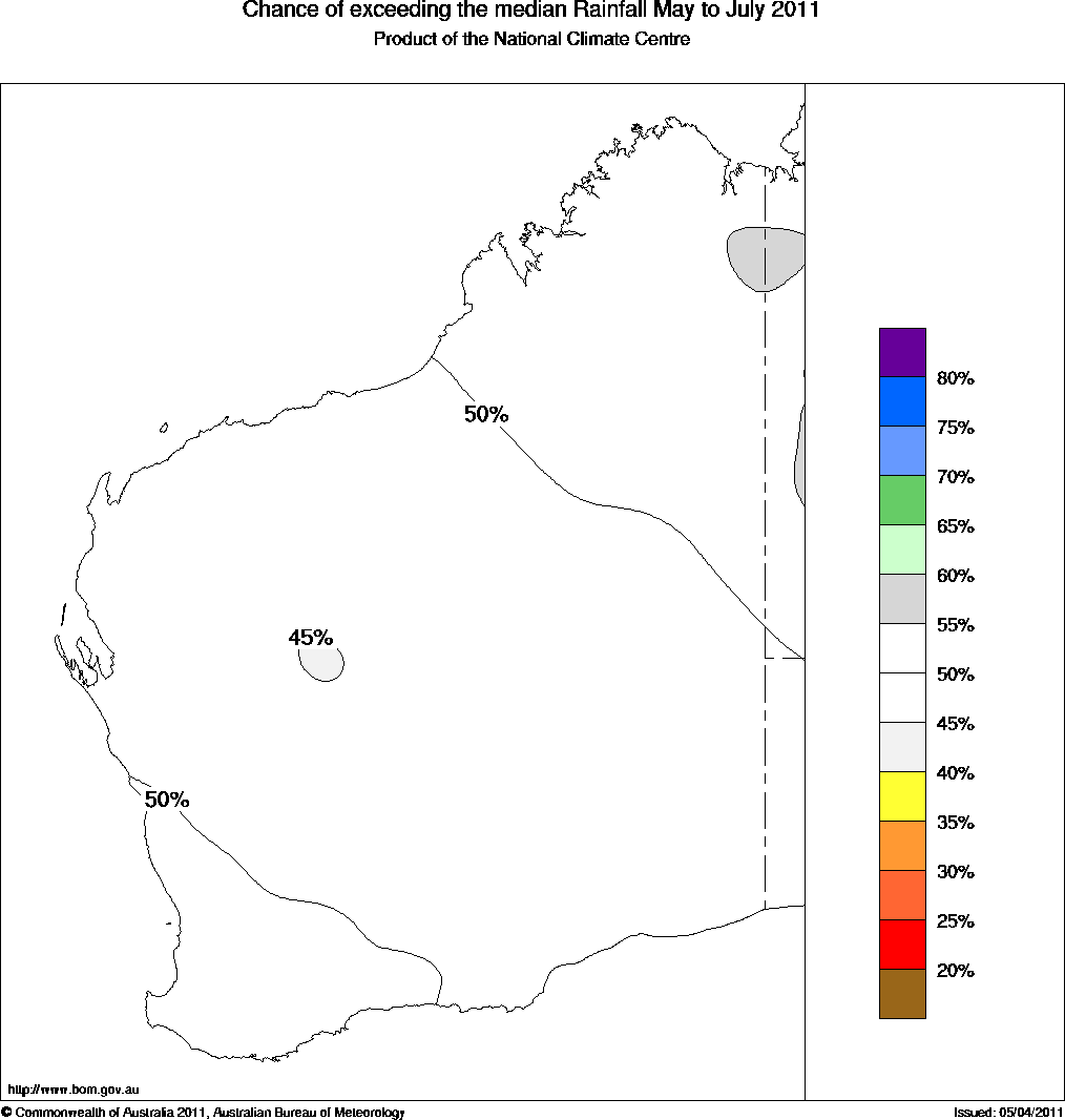 WA Seasonal Rainfall Outlook: probabilities for May to July 2011, issued 19th April 2011