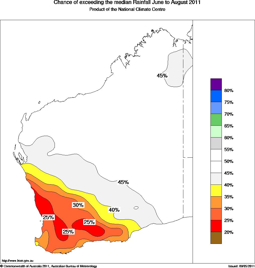 More information on this outlook is available from 8.30am to 4.30pm (WST) Monday to Friday by contacting the Climate Services Centre in the Bureau's Perth Office: (08) 9263 2222.