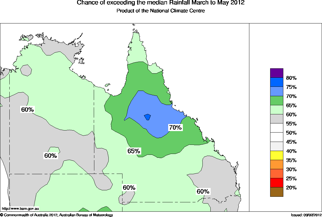 The chances of receiving above median rainfall for the coming three months are between 60 and 70% over most of Queensland and the central to northern NT (see figure). Such odds mean that for every ten years with similar ocean patterns to those currently observed, about six or seven years would be expected to be wetter than average over these areas, while about three or four would be drier during the March to May period.