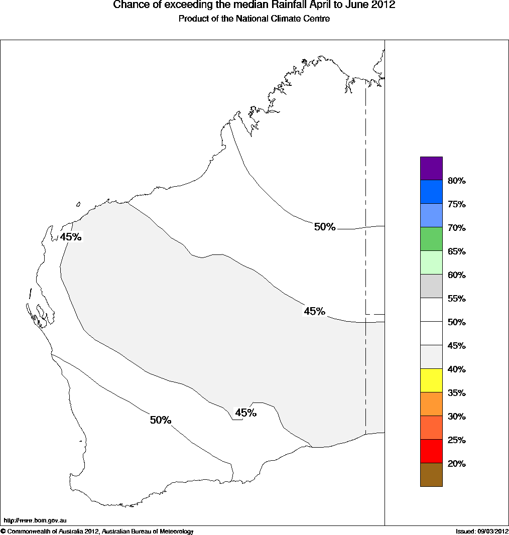 More information on this outlook is available from 8.30am to 4.30pm (WST) Monday to Friday by contacting the Climate Services Centre in the Bureau's Perth Office: (08) 9263 2222.