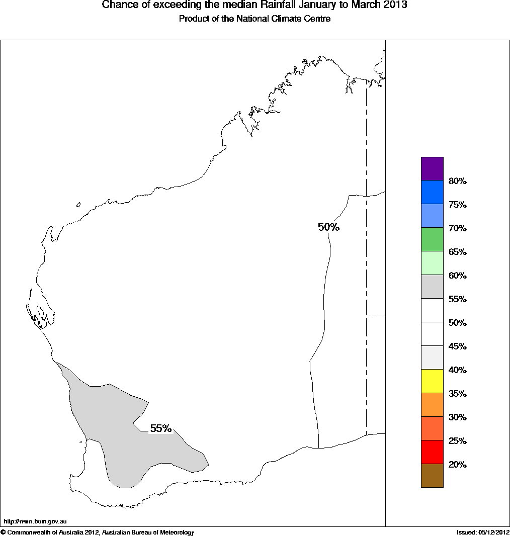 The chances of receiving above median rainfall averaged over the first three months of 2013 are roughly equal across WA (see map above). Such odds mean that for every ten years with similar ocean patterns to those currently observed, about five would be expected to be wetter than average over these areas, while about five years would be expected to be drier.