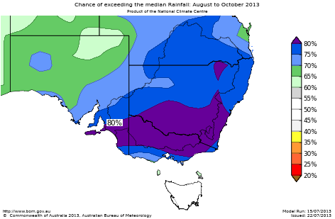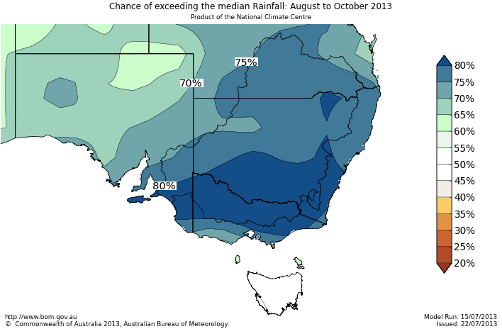 The chance of exceeding the median rainfall for August to October is greater than 60% over mainland southeast Australia. The chance rises to more than 80% over southern NSW, most of Victoria, and southeast SA. Such odds mean that for every ten years with similar climate patterns to those currently observed, about six to eight August to October periods would be expected to be wetter than average over these areas, while about two to four would be drier.