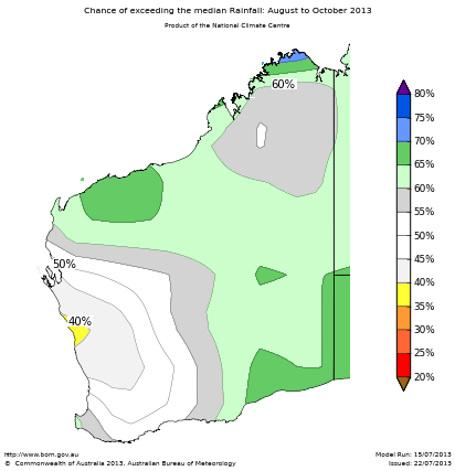 The chance of exceeding median rainfall for August to October is between 60% and 70% over the Pilbara, coastal parts of the Kimberley, and much of eastern WA. Such odds mean that for every ten years with similar climate patterns to those currently observed, about six or seven August to October periods would be expected to be wetter than average over these areas, while about three or four would be drier. However, it should be noted that rainfall is typically low at this time of year around northern WA, and contributes only a small part to the annual total. The chance of receiving a wetter or drier than normal August to October is roughly equal (i.e., close to 50%) over much of the Southwest Land Division and southern Gascoyne.