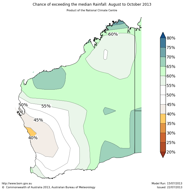 A negative Indian Ocean Dipole (IOD) event is in progress, and is expected to persist through spring 2013. A negative IOD during winter-spring generally increases the chances of above normal rainfall over southern Australia. This is reflected in the current rainfall outlook in eastern parts of WA, although negative IOD events have less of an influence in the southwest of the State.
