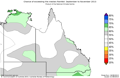 The outlook favours above normal rainfall for most of the Top End, however, south of about Katherine odds decrease such that there is an equal chance of above or below average rainfall. The chance of exceeding the median rainfall for September to November is more than 60% along the Queensland southern border, Herbert and Lower Burdekin district, the Top End of the NT, and in the southeast corner of the NT (Simpson Desert area). The chance rises to 65% along the north coast of the NT and the Tiwi Islands. Such odds mean that for every ten years with similar climate patterns to those currently observed, about six to seven September to November periods would be expected to be wetter than average over these areas, while about two to three would be drier. Over the rest of northern Australia, where the odds show near a 50% chance of exceeding the median rainfall, there is an equal chance of seeing above normal rainfall as below normal.