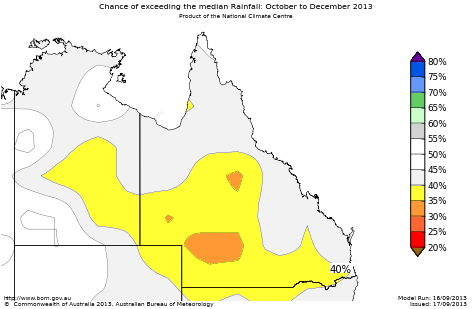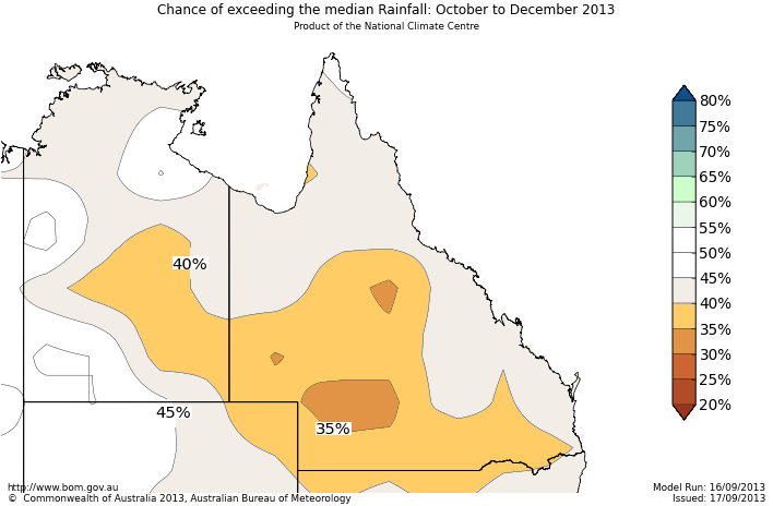 The chance of exceeding the median rainfall during October to December is less than 40% over most of southern and central west Queensland, as well as the central parts of the NT. In other words, there is a 60% chance of seeing below average rainfall over these regions. Such odds indicate that for every ten years with similar climate patterns to those currently observed, about six to seven 3–monthly periods would be expected to be drier than average over these areas, while about three to four would be wetter.