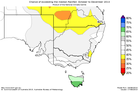 In contrast, odds suggest a greater than 60% chance of below average rainfall in parts of northern NSW and northeast SA. Across the remaining areas of mainland southeast Australia the chances of receiving a wetter or drier than normal October to December period are roughly equal (i.e. 50%).