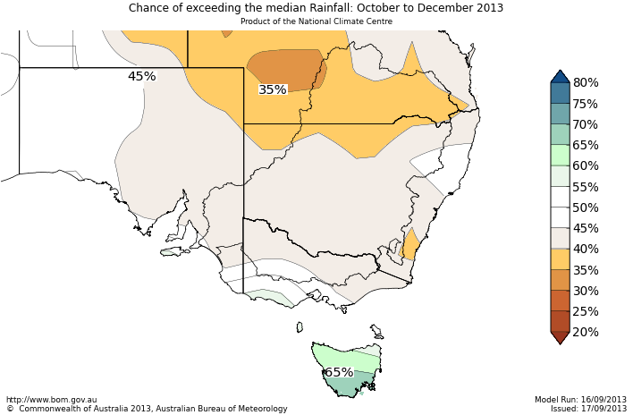 The tropical Pacific has remained ENSO-neutral since mid-2012. Dynamical models surveyed by the Bureau suggest ENSO-neutral conditions are likely for the remainder of 2013. This means there is no strong shift in the odds from the tropical Pacific, and is reflected to some degree in the rainfall outlook, with much of the country having odds close to 50%.