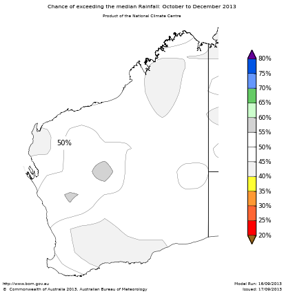 The chance of receiving a wetter or drier than normal October to December is roughly equal (i.e. close to 50%) across most of WA. Such odds mean that for every ten years with similar climate patterns to those currently observed, about five October to December periods would be expected to be wetter than average over these areas, while five would be drier.