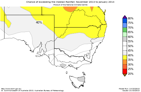 The chance of receiving a wetter or drier than normal November to January period is roughly equal (i.e., close to 50%) over the remaining areas of southeast Australia.